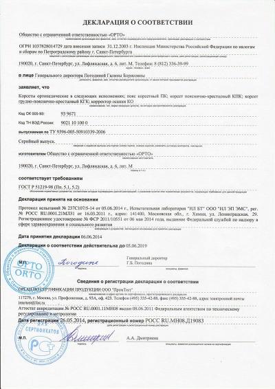 Ортез ORTO КГК 110 с разъемной основой анатомической формы, нерастяжимой центральной частью и эластичными боковыми частями. Фиксирующие элементы представлены в виде моделируемых ребер жесткости и эластичных ремней. Два длинных ребра жесткости расположены вдоль позвоночника, два коротких ― по бокам центральной части. Количество эластичных ремней ― одна или две пары ― зависит от размера изделия. Элементы коррекции ― реклинирующие ремни ― прикреплены к основе и снабжены смягчающими вставками, обеспечивающими комфорт в процессе ношения. В центральной части основы располагается шлевка для удержания реклинирующих ремней. По краям боковых частей основы, эластичных и реклинирующих ремней расположены застежки «Велкро».